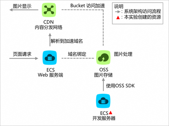 本实验以图片分享网站为原型。该网站拥有大量静态文件,作为一个图片分享平台,需要根据用户请求,实时地将用户的原图在线转换成需要的图片。本实验使用ECS作为Web服务端,使用OSS服务作为图片存储,解决了图片在线处理的问题。由于使用OSS的图片处理功能需要进行域名绑定,事先已将OSS bucket和指定的ECS Web服务器端进行域名绑定,并进行CNAME配置。配置完成后,即可通过ECS Web服务端域名访问OSS bucket保存的静态数据。