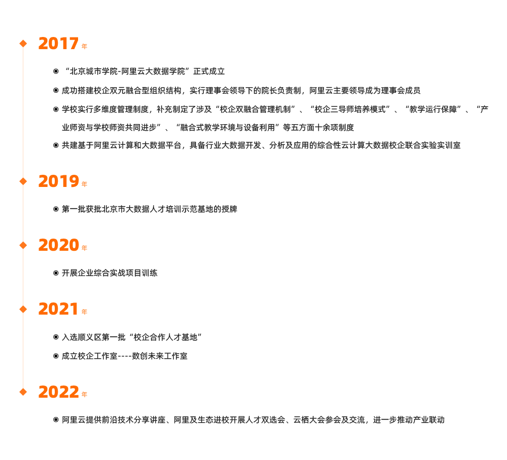 为构建能够初步适应“新工科”环境下工程技术人才培养、面向需求、学生为本、能力为重、协同育人的应用型人才培养模式,阿里云联合北京城市学院成立了“北京城市学院-阿里云大数据学院”,共同探索多种合作模式、建立运行保障机制等多方面深化校企合作、创新人才培养模式,为创建面向产业的大数据学院提供了研究基础、积累了实践经验。学院目前共有计算机科学与技术、软件工程、数据科学与大数据技术3个专业,800多名在校生。学院以“政、产、学、研、创”五位一体的核心要素,形成产业协同、创新人才培养的新型校企合作模式。