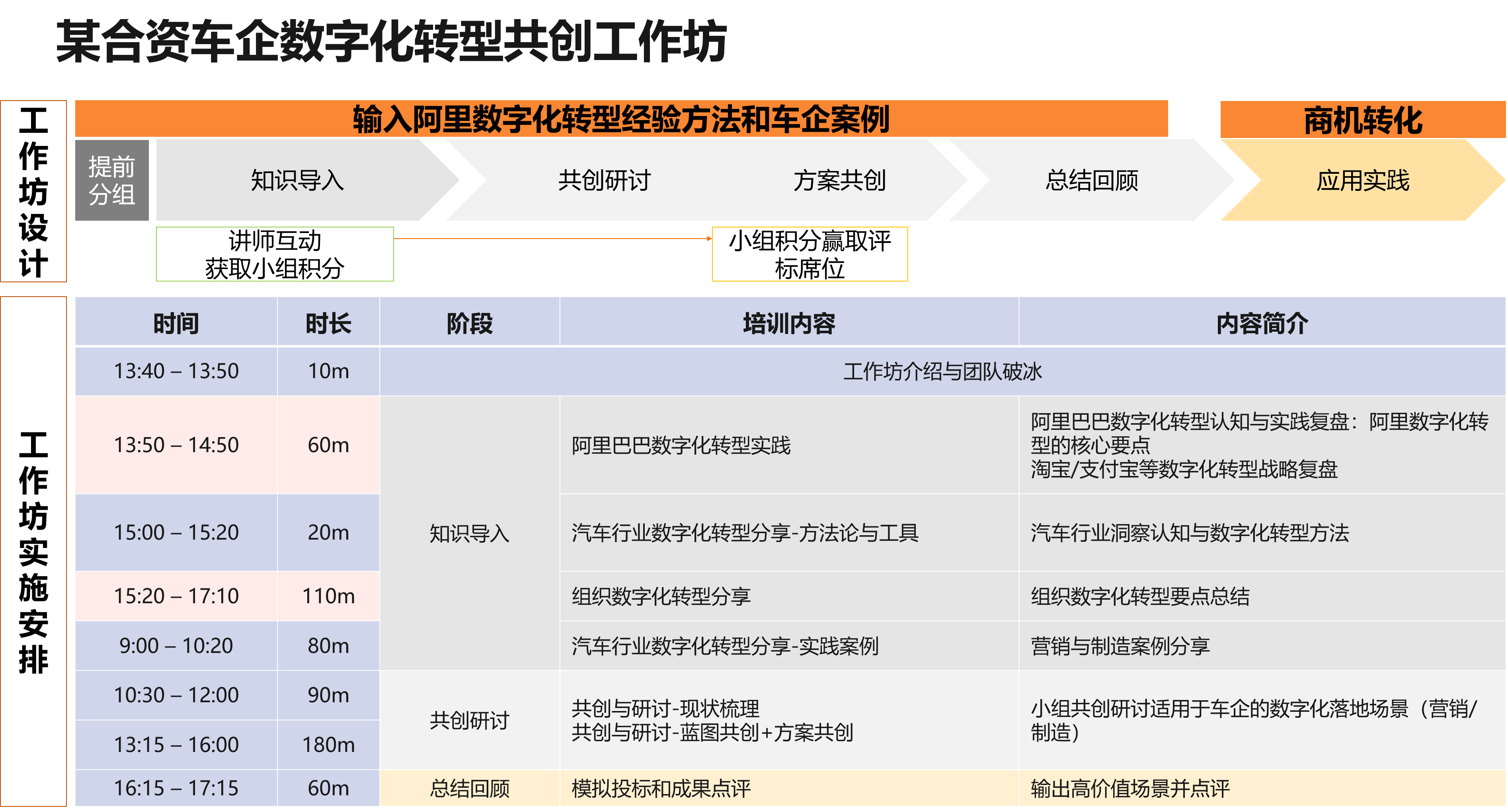通过前期充分调研及需求对焦,确定数字化共创工作坊的课程设计和交付实施细节,如下: